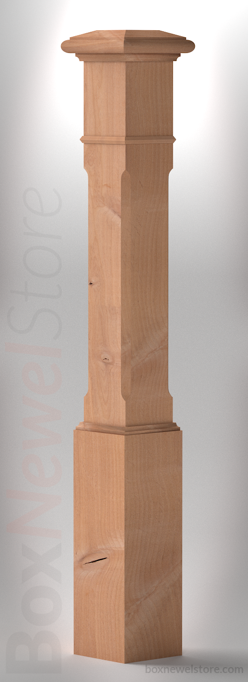 Box Newel Store Classic Knotty Alder Box Newel, SFI Classic Cap with Cove, Chamfor Panels, Pencil Mold Trimband, Loose Basewrap with Cove