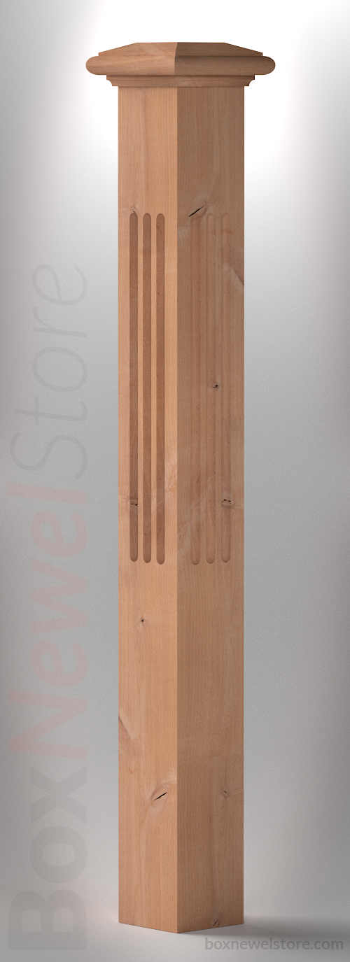 Box Newel Store Classic Knotty Alder Box Newel, SFI Classic Cap with Cove, Flute Panels