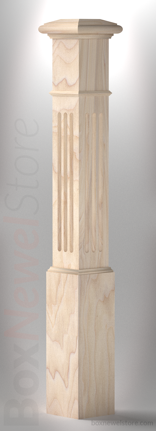 Box Newel Store Classic Paint Grade Box Newel, SFI Classic Cap with Cove, Flute Panels, Pencil Mold Trimband, Loose Basewrap with Cove