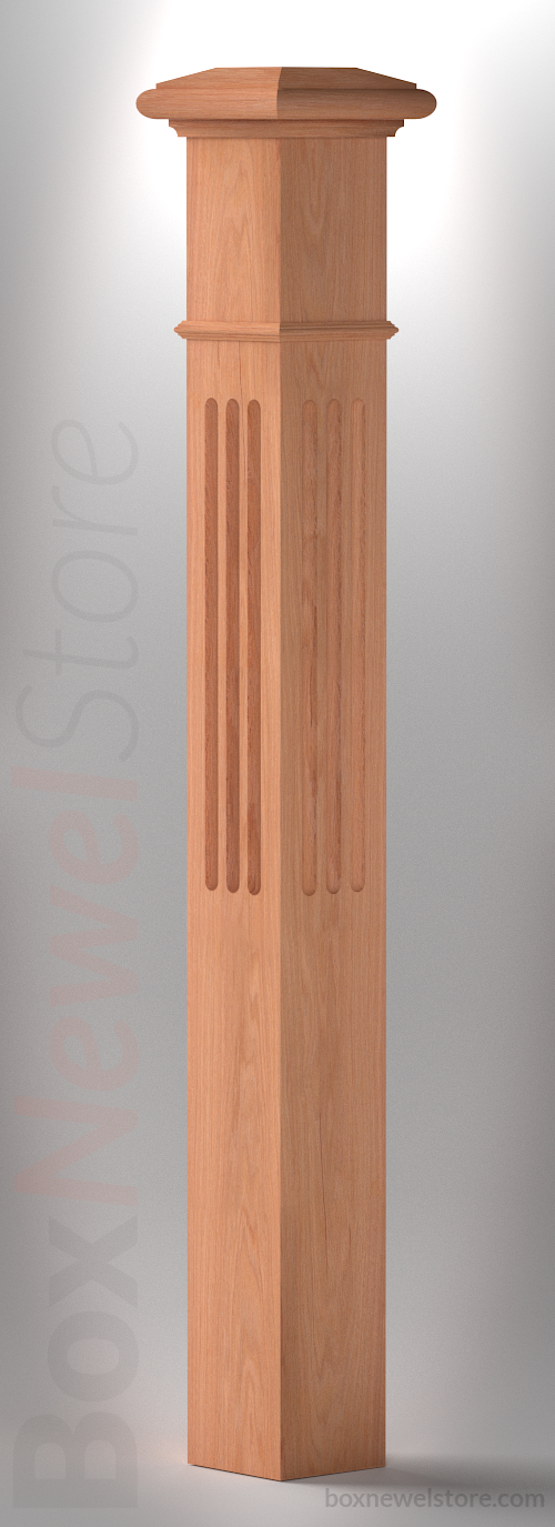 Box Newel Store Classic Red Oak Box Newel, SFI Classic Cap with Cove, Flute Panels, Pencil Mold Trimband