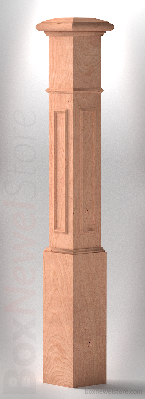 Box Newel Store Classic Cherry Box Newel, SFI Classic Cap with Cove, Lower Planton Panels, Pencil Mold Trimband, Loose Basewrap with Cove