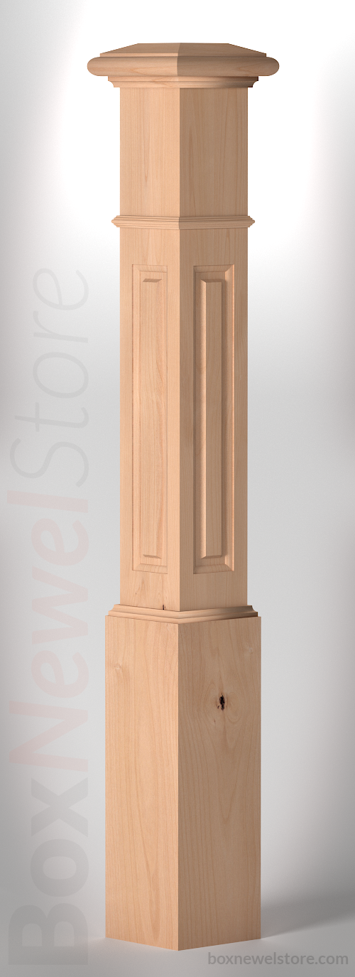 Box Newel Store Classic Clear Alder Box Newel, SFI Classic Cap with Cove, Lower Raised Panels, Pencil Mold Trimband, Loose Basewrap with Cove