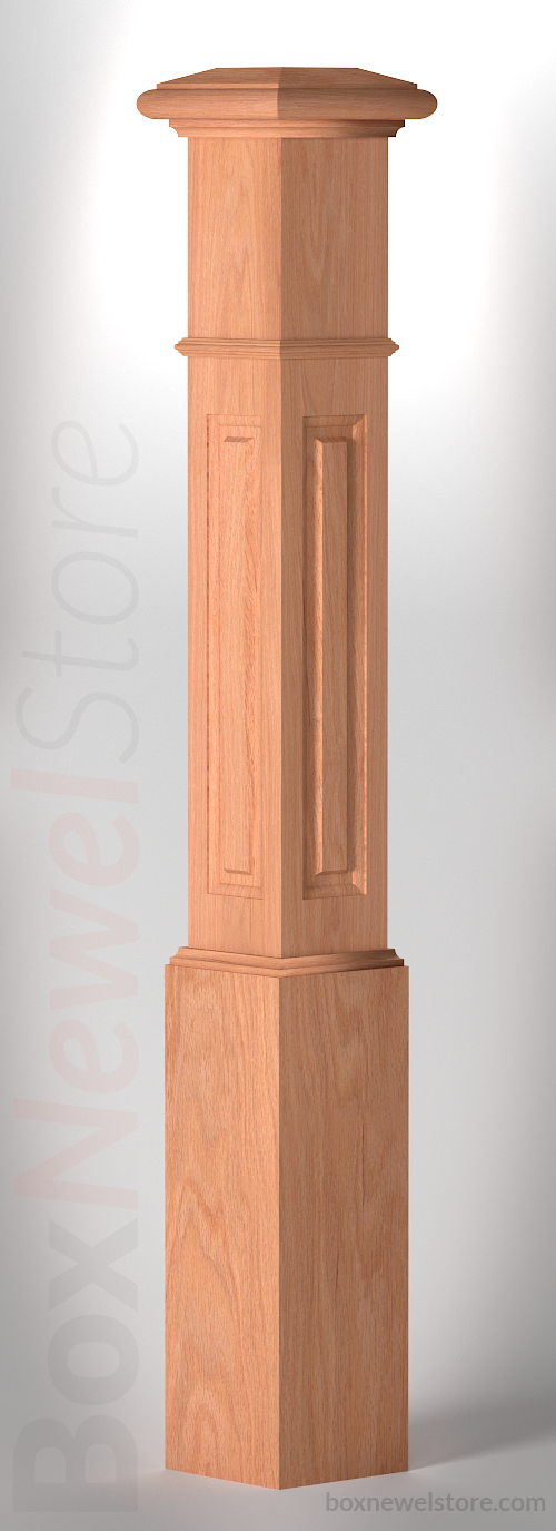 Box Newel Store Classic Red Oak Box Newel, SFI Classic Cap with Cove, Lower Raised Panels, Pencil Mold Trimband, Loose Basewrap with Cove