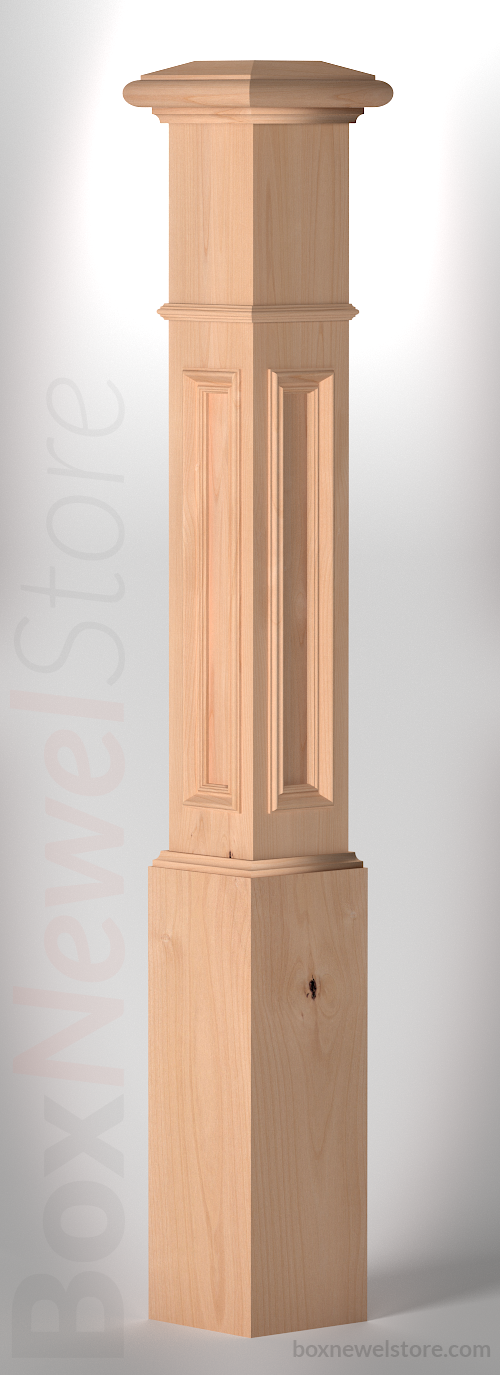 Box Newel Store Classic Clear Alder Box Newel, SFI Classic Cap with Cove, Lower Recessed Panels with Panel Cap, Pencil Mold Trimband, Loose Basewrap with Cove