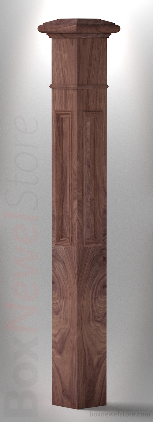 Box Newel Store Classic Walnut Box Newel, SFI Classic Cap with Cove, Lower Recessed Panels with Panel Cap, Pencil Mold Trimband