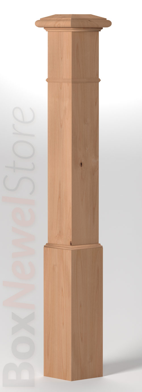 Box Newel Store Classic Clear Alder Box Newel, SFI Classic Cap with Cove, Pencil Mold Trimband, Loose Basewrap with Cove