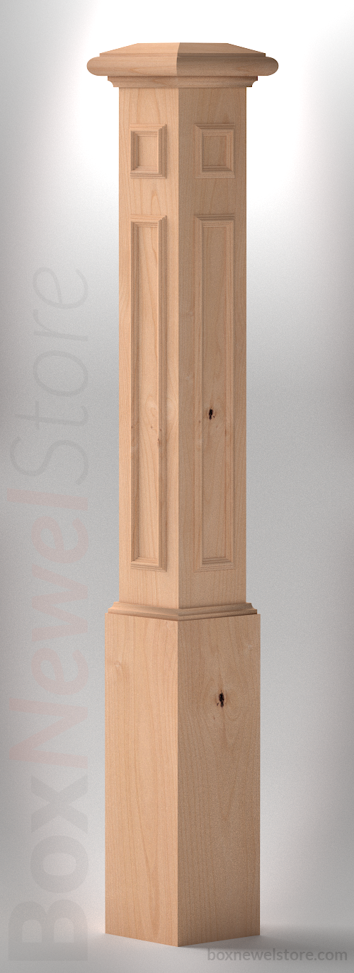 Box Newel Store Classic Clear Alder Box Newel, SFI Classic Cap with Cove, Upper-Lower Planton Panels, Loose Basewrap with Cove