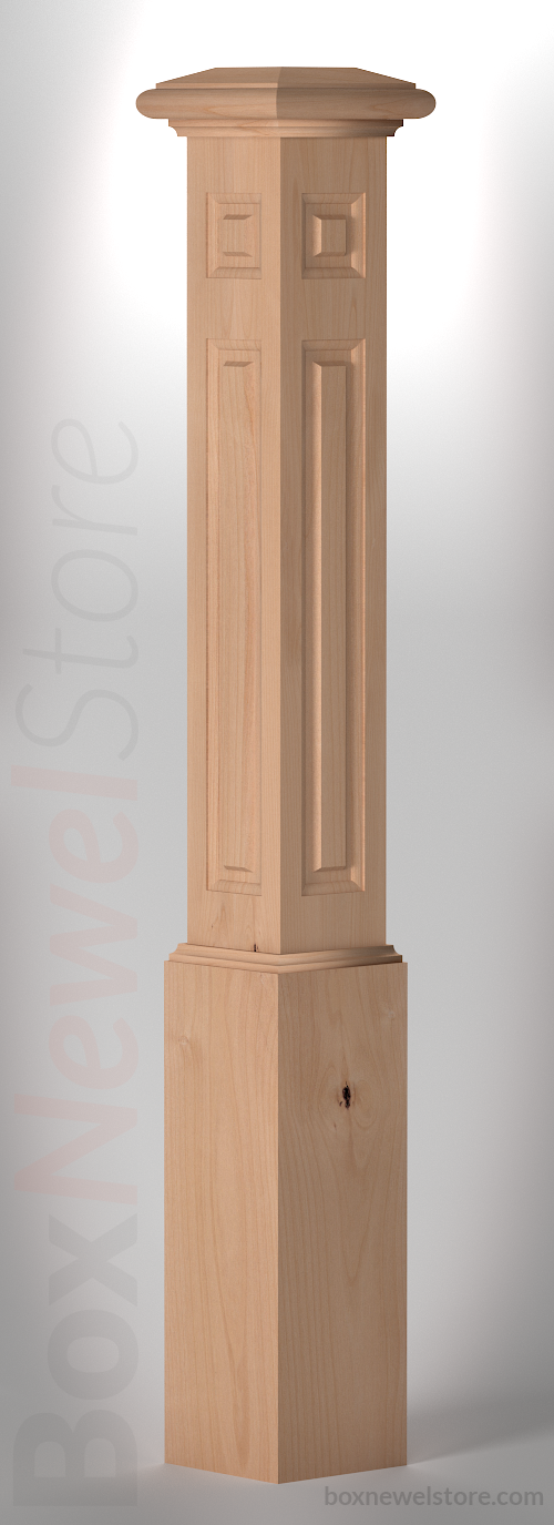 Box Newel Store Classic Clear Alder Box Newel, SFI Classic Cap with Cove, Upper-Lower Raised Panels, Loose Basewrap with Cove