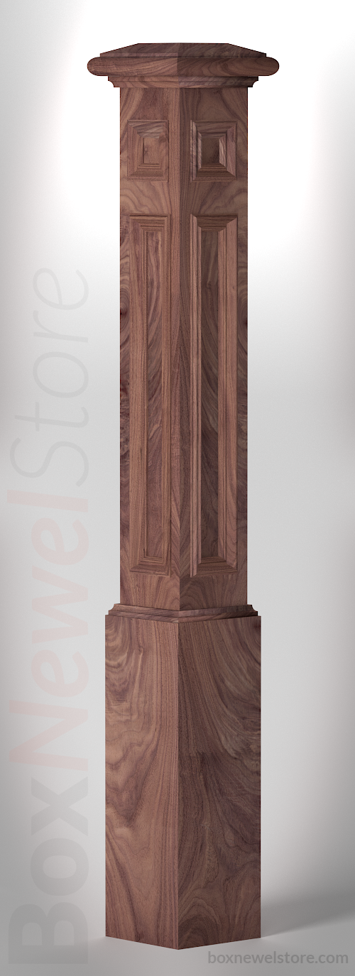Box Newel Store Classic Walnut Box Newel, SFI Classic Cap with Cove, Upper-Lower Recessed Panels with Panel Cap, Loose Basewrap with Cove